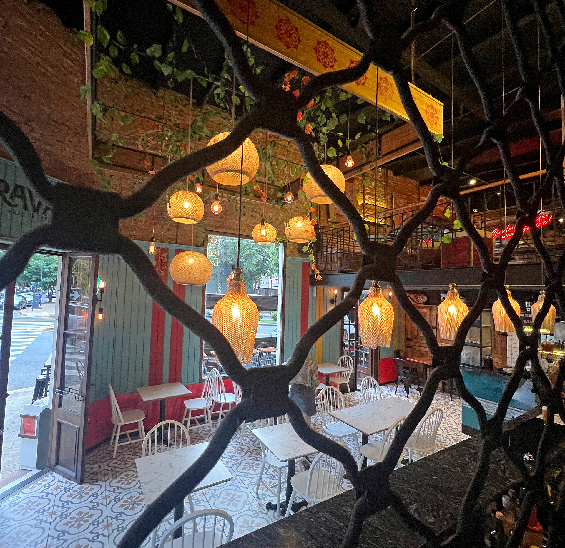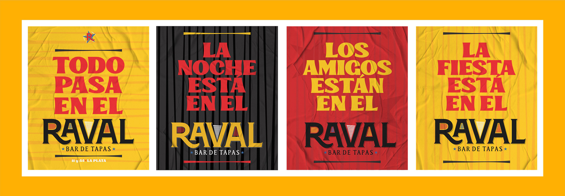 El proyecto nace a partir de una consigna simple: crear un bar de tapas. Desde ahí empezamos a construir todo lo demás.Comenzamos por el naming, inspirado en El Raval de Barcelona: un barrio intenso, mestizo y nocturno, donde conviven la cultura, la calle, el encuentro y la fiesta. Ese espíritu fue el eje conceptual que guió todo el trabajo. De ahí surge el claim “Todo pasa en el Raval”, una frase abierta, que se expande y se resignifica —la fiesta pasa en el Raval, los amigos están en el Raval— y que refleja lo que sucede puertas adentro.
