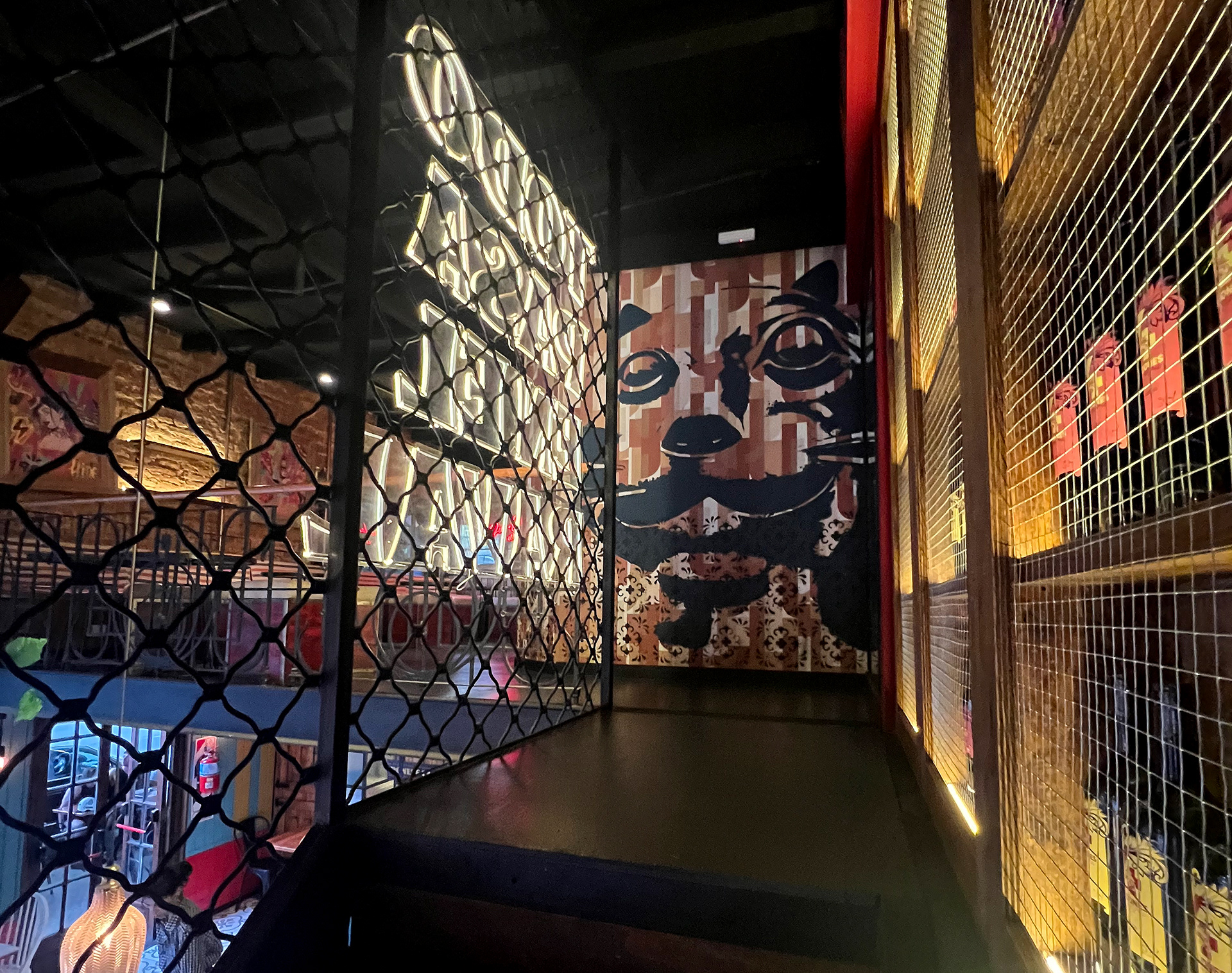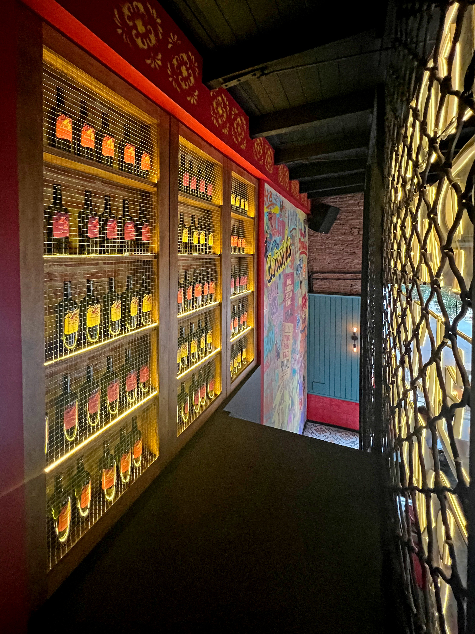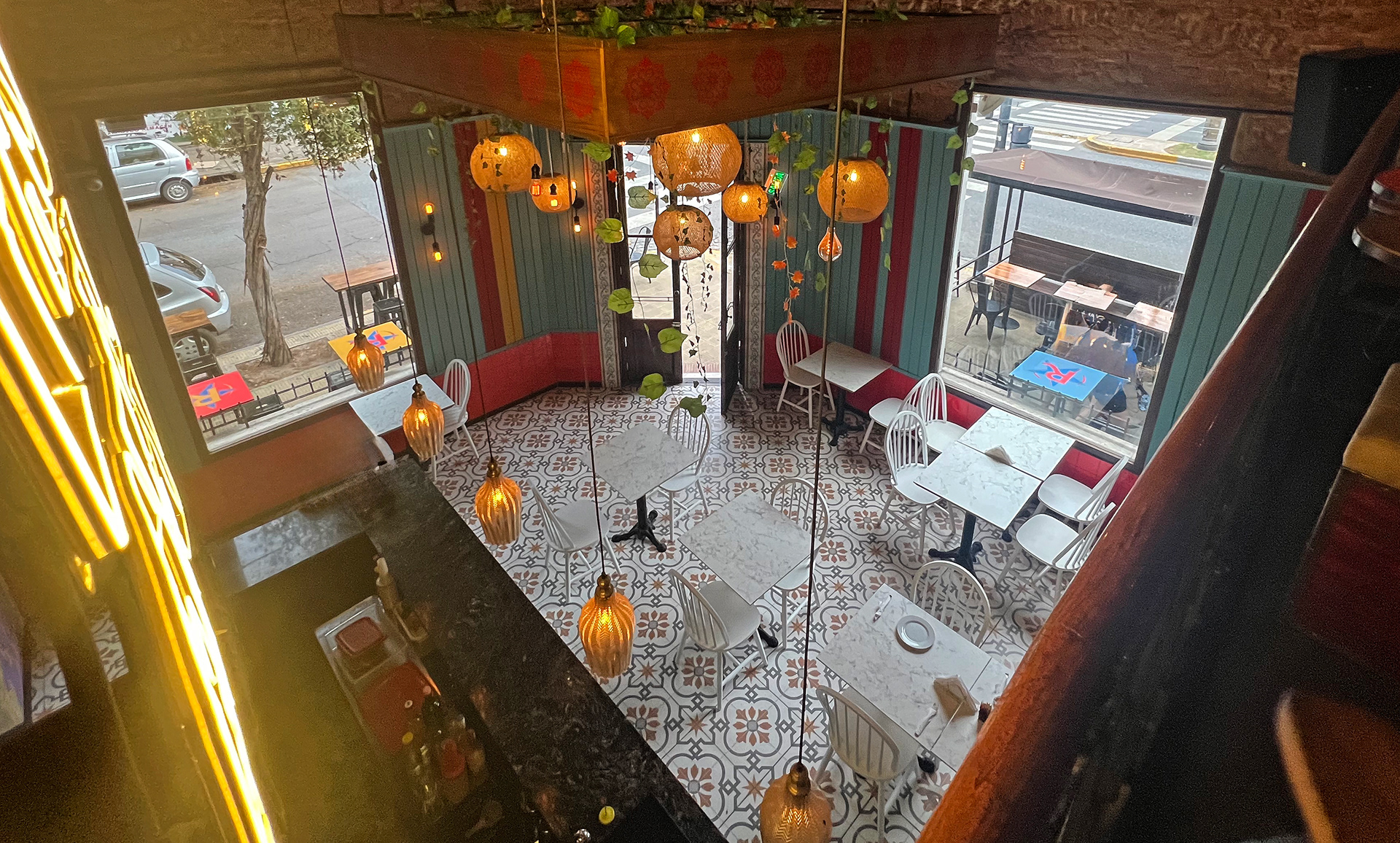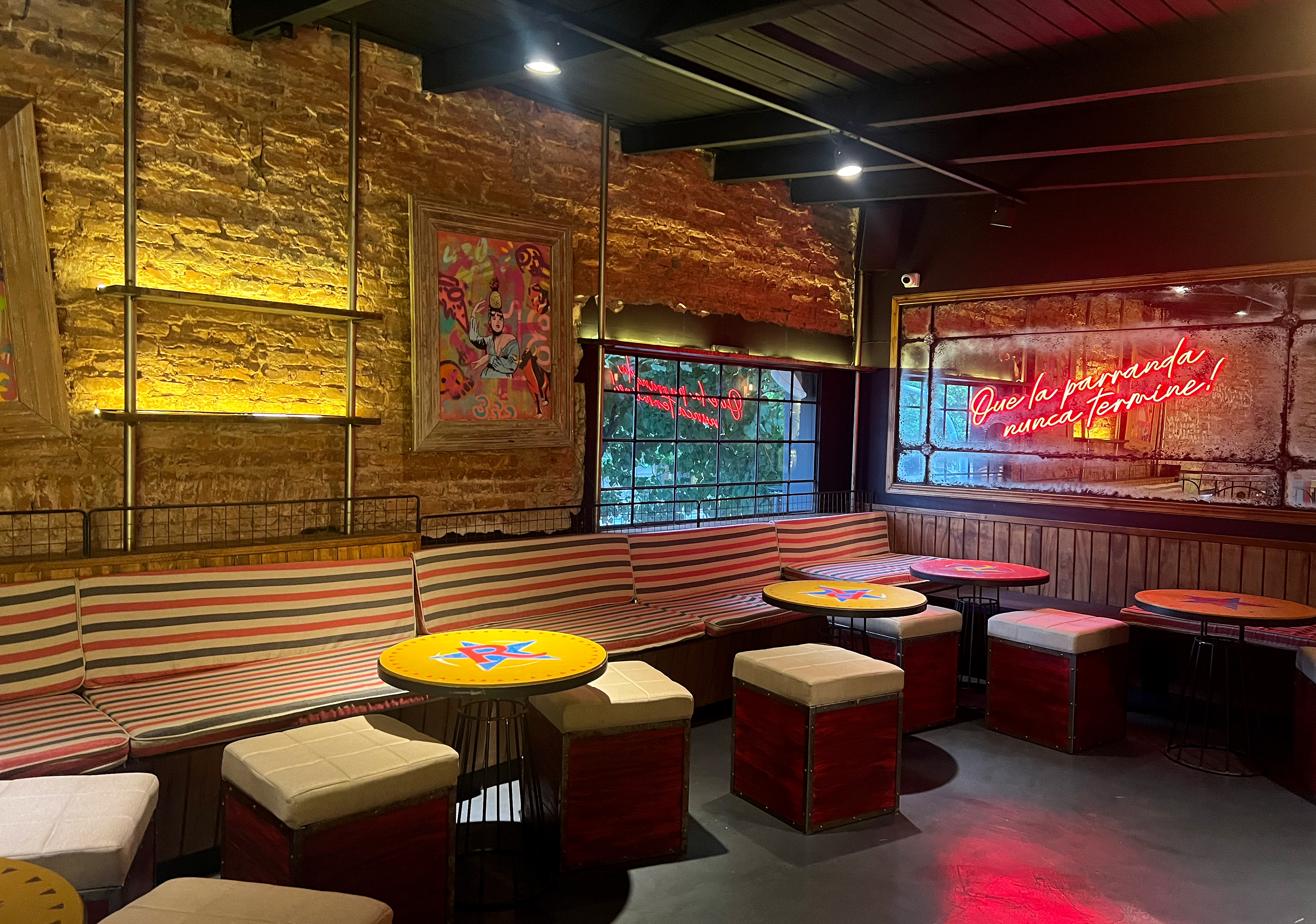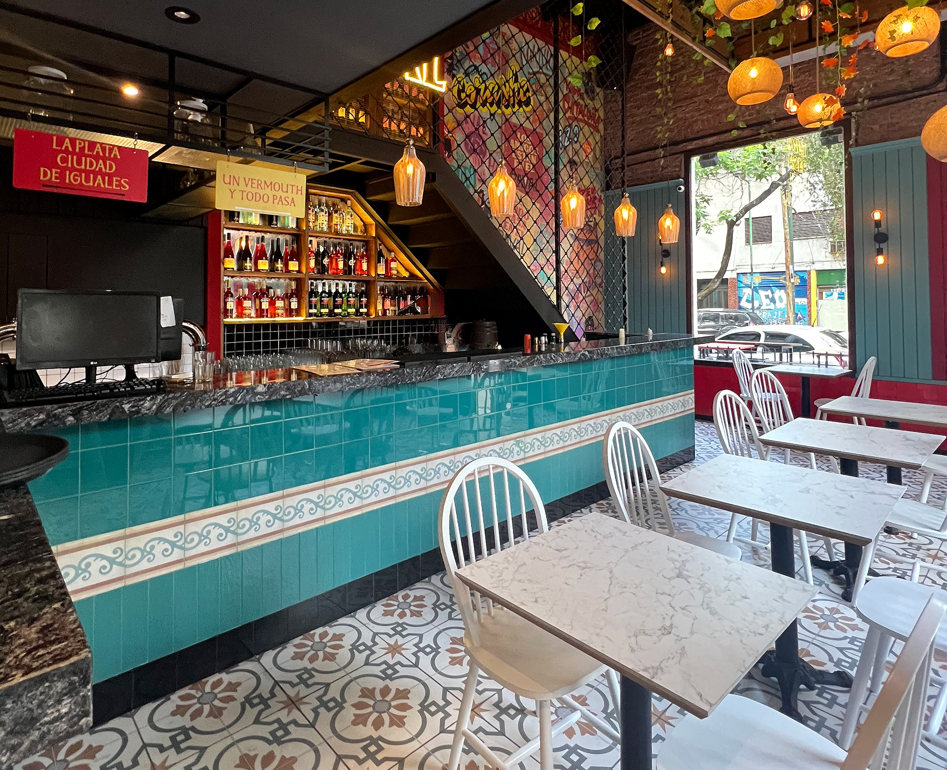 El diseño interior acompaña esa idea con decisiones claras: colores, azulejos, grafitis, cartelería, murales y mensajes que remiten a la calle, al movimiento y a lo espontáneo. Elementos gráficos que no están solo para decorar, sino para construir identidad. La iluminación cálida, la doble altura, las texturas y la materialidad terminan de darle forma a un espacio vivo, que cambia y se transforma con el paso del día y la noche.